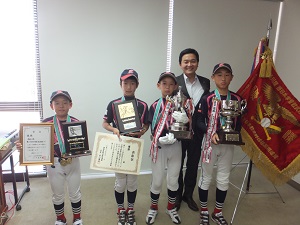 17日、北野少年野球クラブに所属する、小郡小学校6年生の松岡大暉さん、長谷川大和さん、5年生の中西心さん、4年生の松岡永さんが、8月に開催された筑後川旗第35回西日本学童軟式野球大会、阿波おどりカップ全国学童軟式野球大会、両大会の優勝報告ということで市役所に来られました。