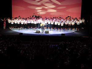 そして、阿久悠さんの遺作となった歌詞に、曲をつけられた東日本大震災の応援ソングである「愛よ急げ」では、三国中学校コーラス部・小郡中学校合唱部・大原中学校特設合唱部・宝城中学校合唱部のみんながステージに上がり、南さんの指揮で、振付合唱を披露し、感動的なステージとなりました。