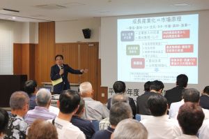 振興大会では、日本農業新聞の緒方大造論説委員が、「どうなる農業・農協の未来!」と題して、講演を行いました。